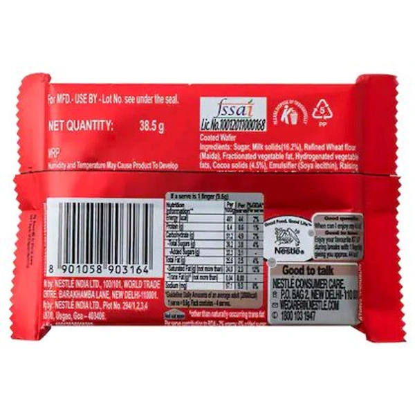 KitKat was first introduced in the UK market in 1935 under the name of Chocolate Crips and has since then remained as the famous four fingers chocolate. KitKat Chocolate contains a handpicked delicious selection of finest quality ingredients. They are incredibly indulgent and the chocolate coated wafer fingers will satisfy any discerning chocoholic's needs. Savour the taste of the smoothness, richness and creaminess with every bite. Let your taste buds sink with an amazing burst of chocolatey flavours. Buy this product online today.Disclaimer: